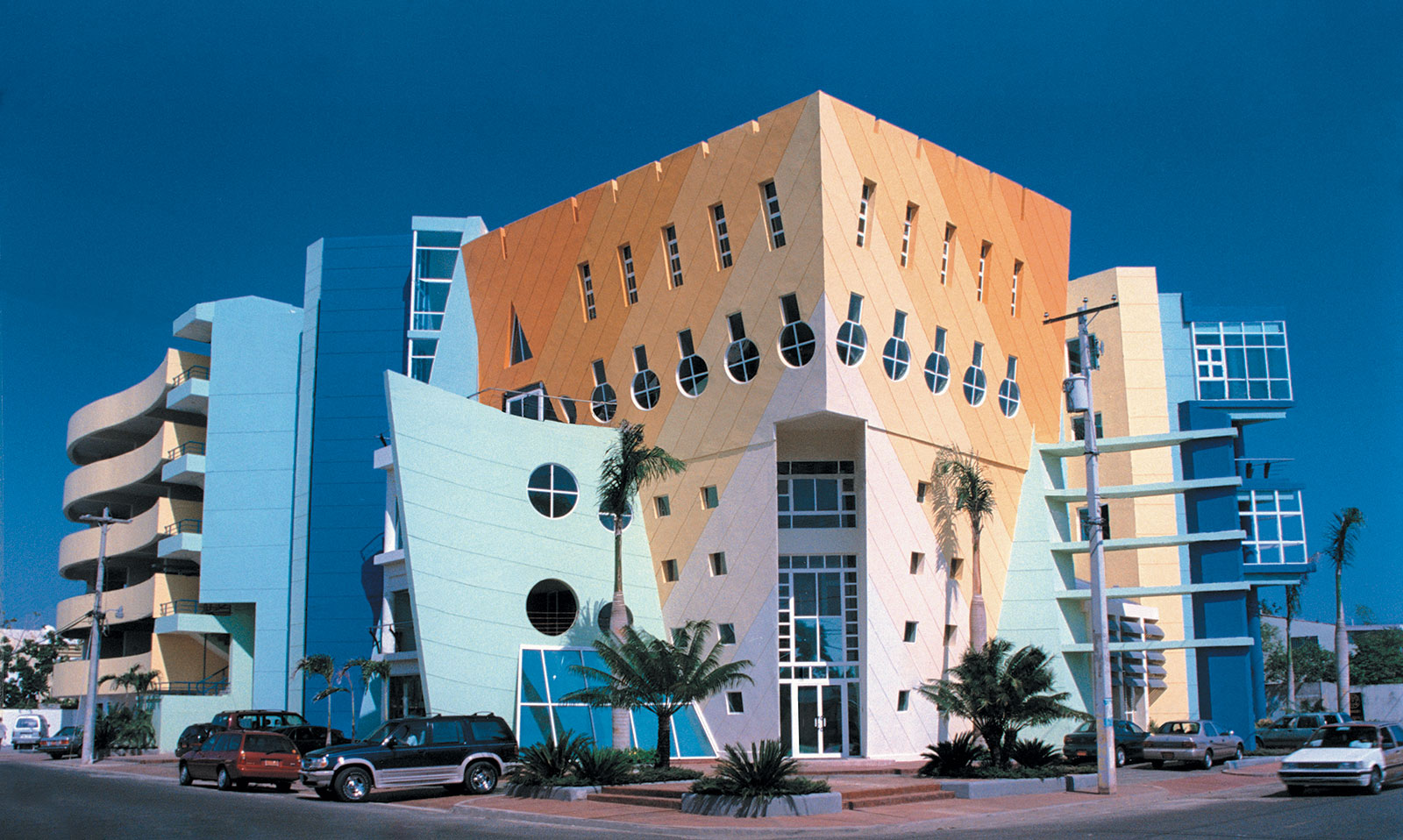Concebido como proyecto multifuncional vinculado a la estética y el bienestar, el Edificio Centre irrumpe en su contexto urbano mediante una volumetría fragmentada y un uso audaz del color, posteriormente alterado con respecto a su propuesta original. Implantado en un lote de esquina, el volumen principal se quiebra para generar llenos y vacíos que dinamizan la relación interior-exterior. La composición, asociada metafóricamente a la anatomía humana, destaca la esquina como pieza dominante. Polémico en su momento, se consolidó como expresión de una arquitectura joven que exploraba identidad, experimentación plástica y ruptura formal.