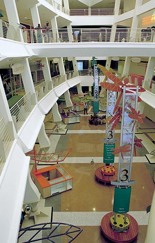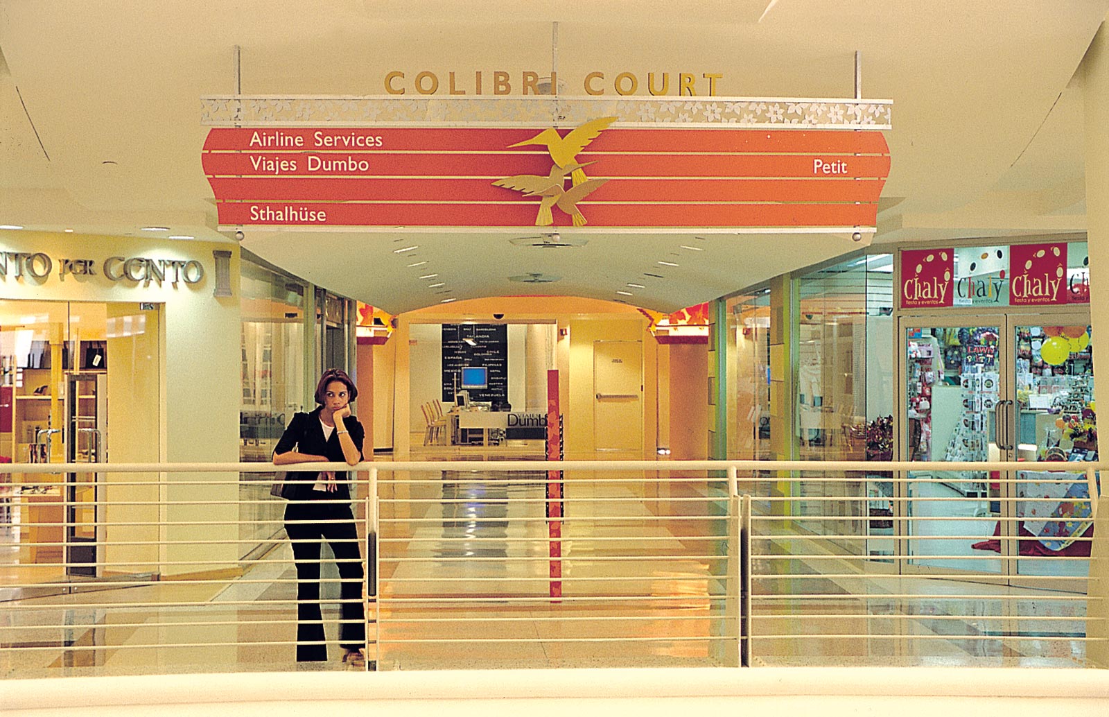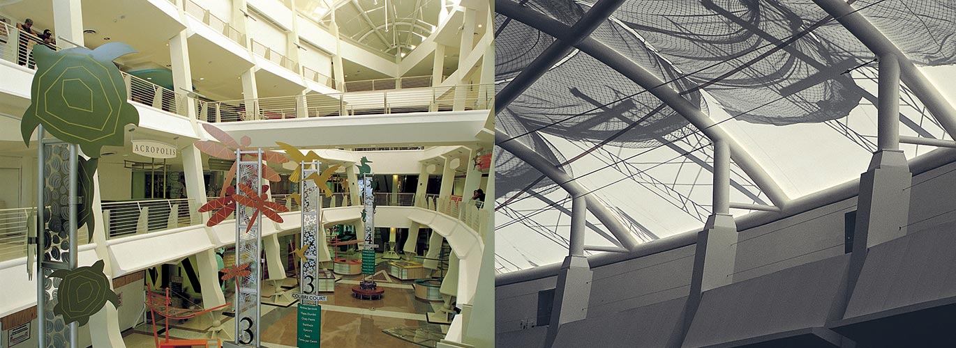 El centro comercial está segmentado; se utilizan cinco personajes que identifican las diversas áreas del mismo y se hacen presentes a través de elementos gráficos sobre el piso o en el techo y se convierten en los iconos a partir de los cuales se desarrolla todo el sistema de señalización. Estos personajes son el colibrí, el hipocampo o caballito de mar, el pez dorado, el carey y la libélula.