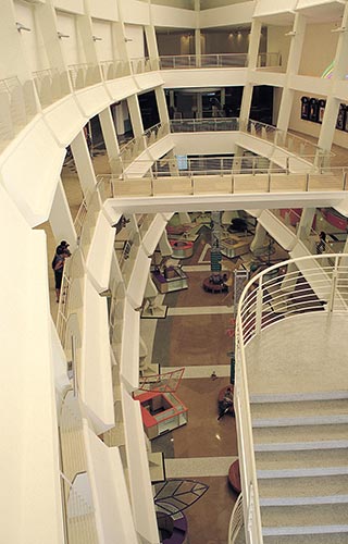 Para el atrium, que posee una altura de cuatro niveles, se prefirió el uso de estructuras metálicas, debido a su concepción espacial de gran altura y la forma de la planta, que varía en elevación.