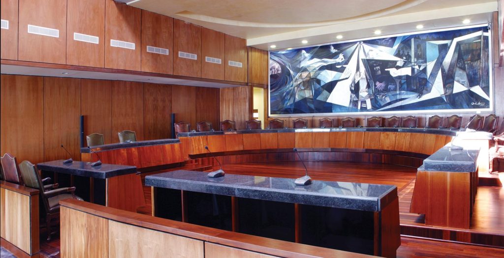 La Sala Augusta está flanqueada, hacia el sur, por el salón de acceso del público desde donde se disfruta plenamente del paisaje del Mar Caribe y de la perspectiva hacia la ciudad de Ovando. En el otro flanco, hacia el norte, la Sala de Deliberación, propia de cada espacio de audiencia, dispuesta en mesa redonda para acoger de manera más democrática al pleno de jueces. La apertura de la cubierta representa el contacto entre los jueces (justicia terrestre) y el cielo (justicia divina).