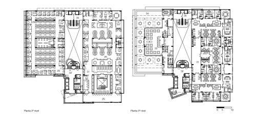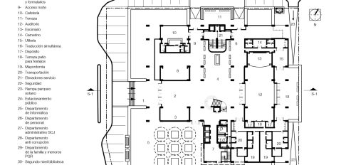 Los pisos tres y dos resuelven las necesidades de la Dirección General Administrativa y de la Dirección Técnica Judicial. La biblioteca requerida por este último departamento se dispone en una doble altura entre los dos niveles, rodeada por una gran cantidad de estaciones de trabajo. El segundo nivel, más cercano a la plaza, resuelve las operaciones del departamento de Recursos Humanos.