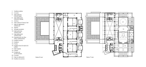 En los tres pisos inferiores al séptimo se disponen las Cámaras que completan el programa. Estas dependencias han permitido, al desarrollarse en la superficie admisible de cada piso, la inclusión de otros departamentos de la institución según el carácter más o menos público de los mismos. Se han vinculado verticalmente las Salas de Audiencia y sus respectivas Salas de Deliberación. La respuesta a este requerimiento de programa proveyó interesantes oportunidades de enriquecimiento, tanto en la sección del proyecto como en su expresión plástica.