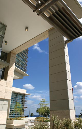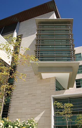 La definición del atrio central como el espacio de articulación del conjunto en cuanto a imagen, función y servicios ha permitido que los bloques oeste y este se configuren estructuralmente como plantas libres de simple resolución técnica, tanto en la estandarización de piezas prefabricadas para las losas como en la dotación de conductos para los diversos sistemas y redes, siguiendo circuitos de clara y eficiente distribución.