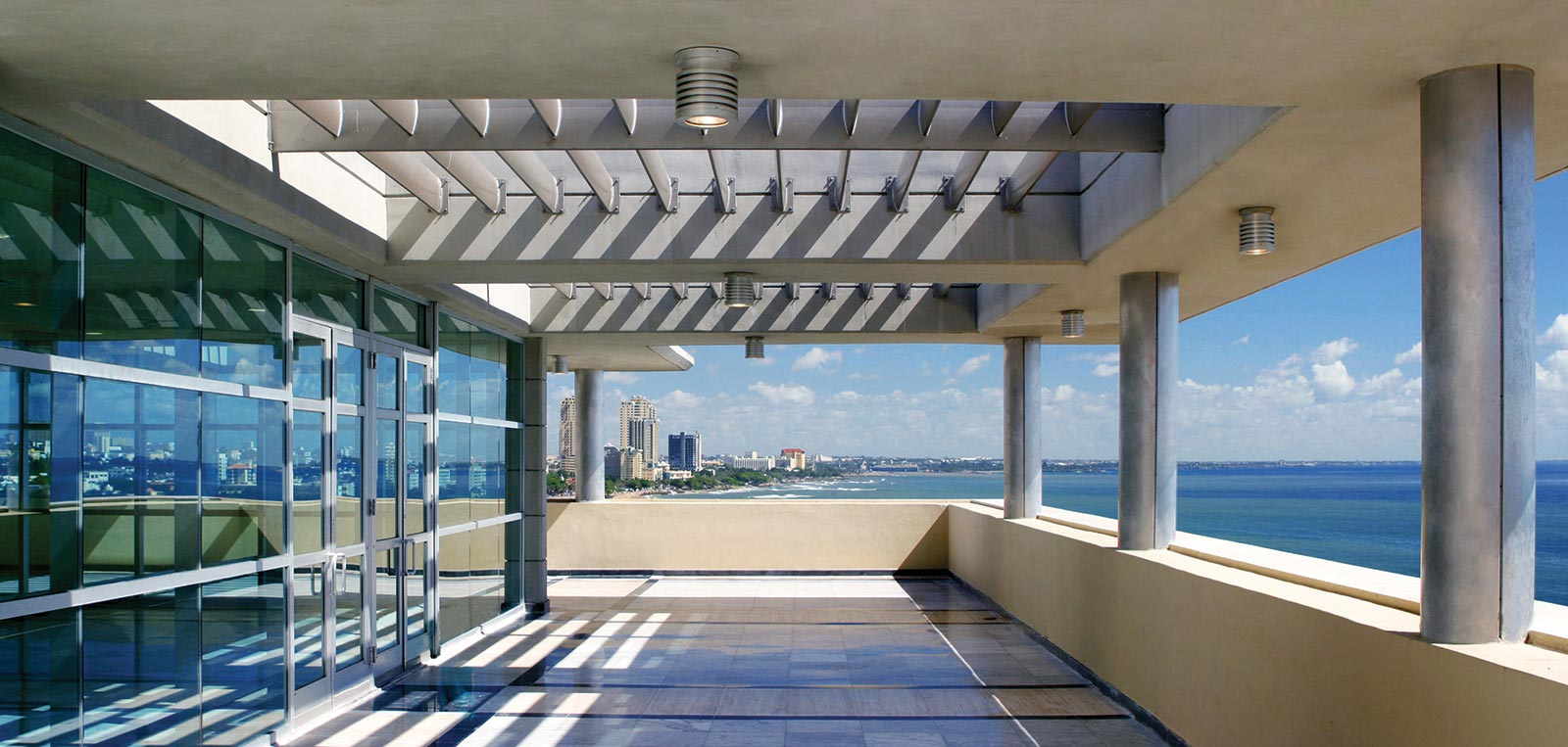 El quinto nivel acomoda de forma elegante y privada un restaurante ejecutivo que, además de su espacio formal, incorpora una terraza jardín cubierta de pérgolas que contribuyen a aligerar la volumetría en este lado del edificio que da al boulevard central. Se retoma la idea del roof garden aplicada tan exitosamente por Guillermo González, maestro de la arquitectura moderna dominicana, en varias edificaciones del período moderno.