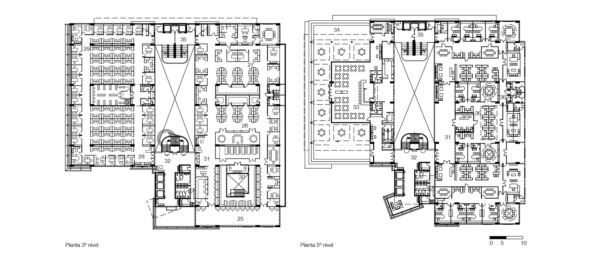 Los pisos tres y dos resuelven las necesidades de la Dirección General Administrativa y de la Dirección Técnica Judicial. La biblioteca requerida por este último departamento se dispone en una doble altura entre los dos niveles, rodeada por una gran cantidad de estaciones de trabajo. El segundo nivel, más cercano a la plaza, resuelve las operaciones del departamento de Recursos Humanos.