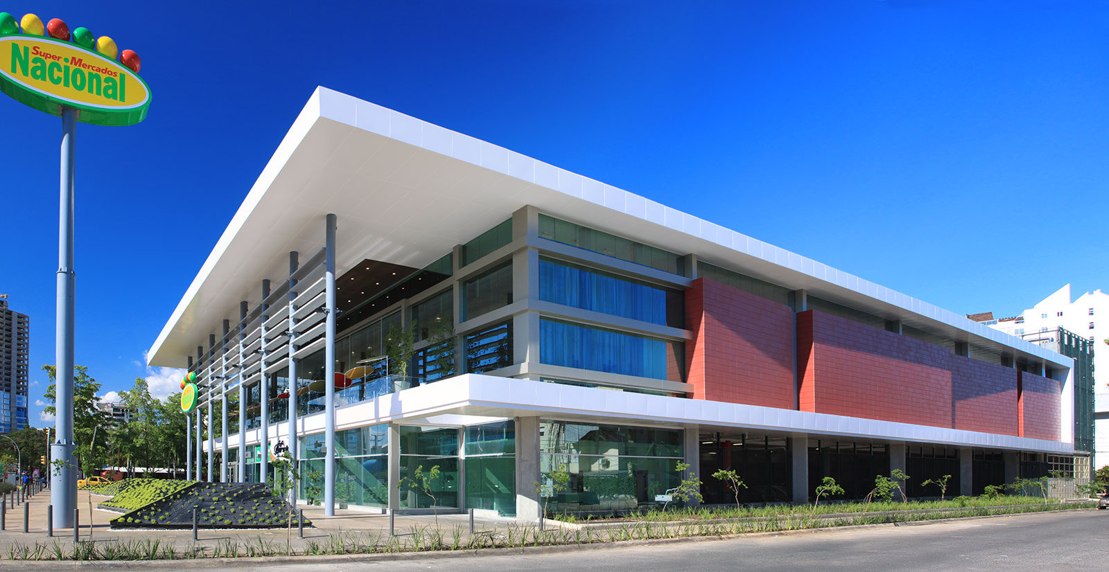 Este supermercado replanteó la tipología comercial a escala de barrio mediante una operación urbana sensible y propositiva. Concebido como edificio de manzana, el volumen ocupa el lote completo y organiza sus funciones en dos niveles, con el supermercado en el segundo piso para liberar la planta baja y activar la plaza frontal. El paisajismo urbano estructura un espacio público que mejora el entorno inmediato. La volumetría se resuelve con cuatro fachadas distintas articuladas bajo un mismo lenguaje, con transparencias, quiebrasoles y amplios alerones que extienden la plaza hacia el edificio. El alerón que descansa sobre la planta baja se convierte en balcón que extiende la plaza al segundo nivel.