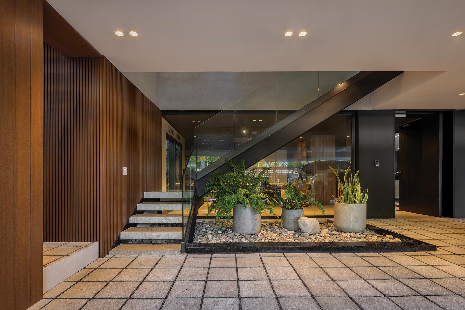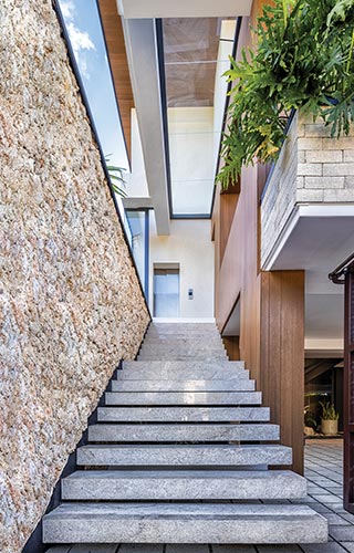 La selección de las terminaciones revela la riqueza espacial de esta narrativa. En las áreas sociales, la amplitud de los ventanales y la doble altura generan transparencias que diluyen los límites entre interior y exterior. Los tonos neutros de los revestimientos se combinan con la calidez de la madera en pisos, techos y paredes, una atmósfera de elegancia contemporánea. Las escaleras, concebidas como piezas escultóricas, conectan visual y físicamente los distintos niveles y se convierten en protagonistas del recorrido.