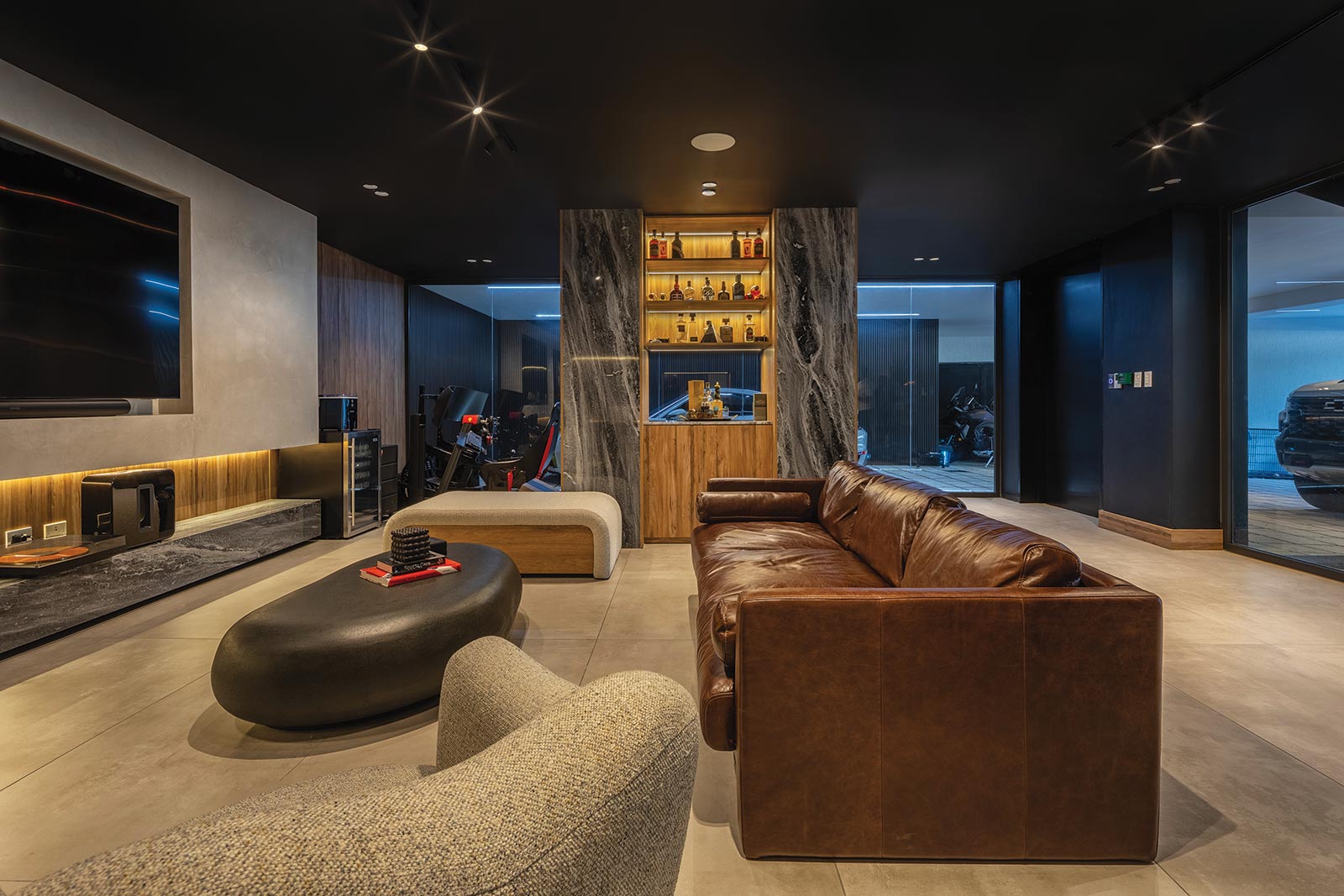 Los recorridos interiores evidencian una estrategia de continuidad entre lo arquitectónico y lo decorativo. El proyecto no se limita a revestir espacios, sino que redefine su carácter a través de la integración de mobiliario a medida, iluminación estratégica y un cuidadoso uso de los materiales. Los planos arquitectónicos permiten entender con claridad esta organización: el nivel de llegada, destinado al garaje y a un estudio ejecutivo, mantiene una línea estética sobria con un matiz más funcional; el segundo nivel, concebido como núcleo social, se abre a dobles alturas y terrazas exteriores, lo que prolonga la vida interior hacia el patio; el nivel tres, reservado a los dormitorios y áreas privadas, refuerza la transición de lo público a lo íntimo.