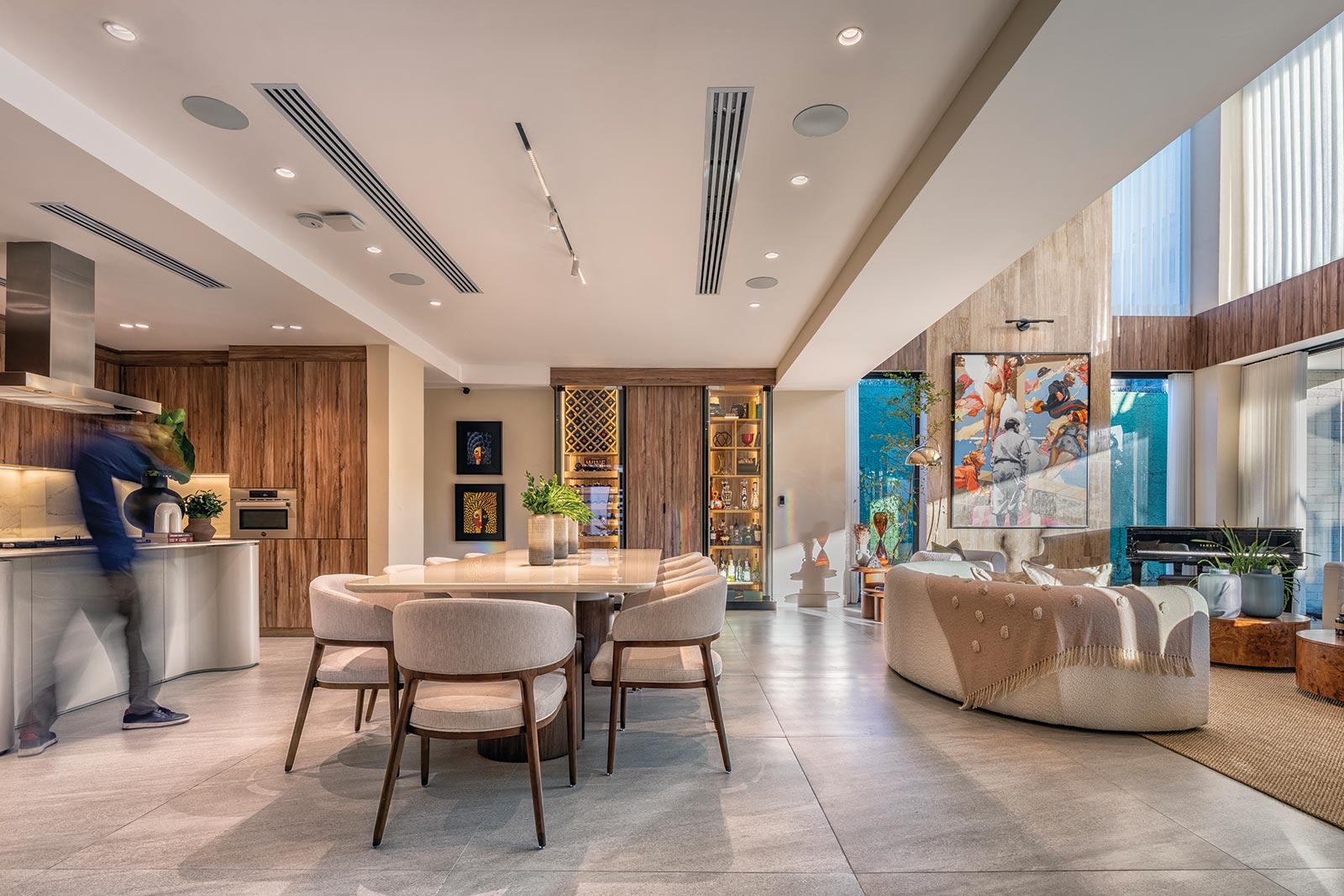El mobiliario cuidadosamente seleccionado o diseñado a medida, en conjunto con el diseño de iluminación, dialoga con el espacio arquitectónico y logra un balance entre elegancia y habitabilidad. Las áreas de estar, el comedor y las terrazas exteriores refuerzan la idea de confort residencial entendido como experiencia integral. No se trata únicamente de lujo visual, sino de la búsqueda de una comodidad esencial que enriquece la vida cotidiana.