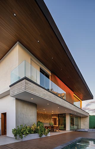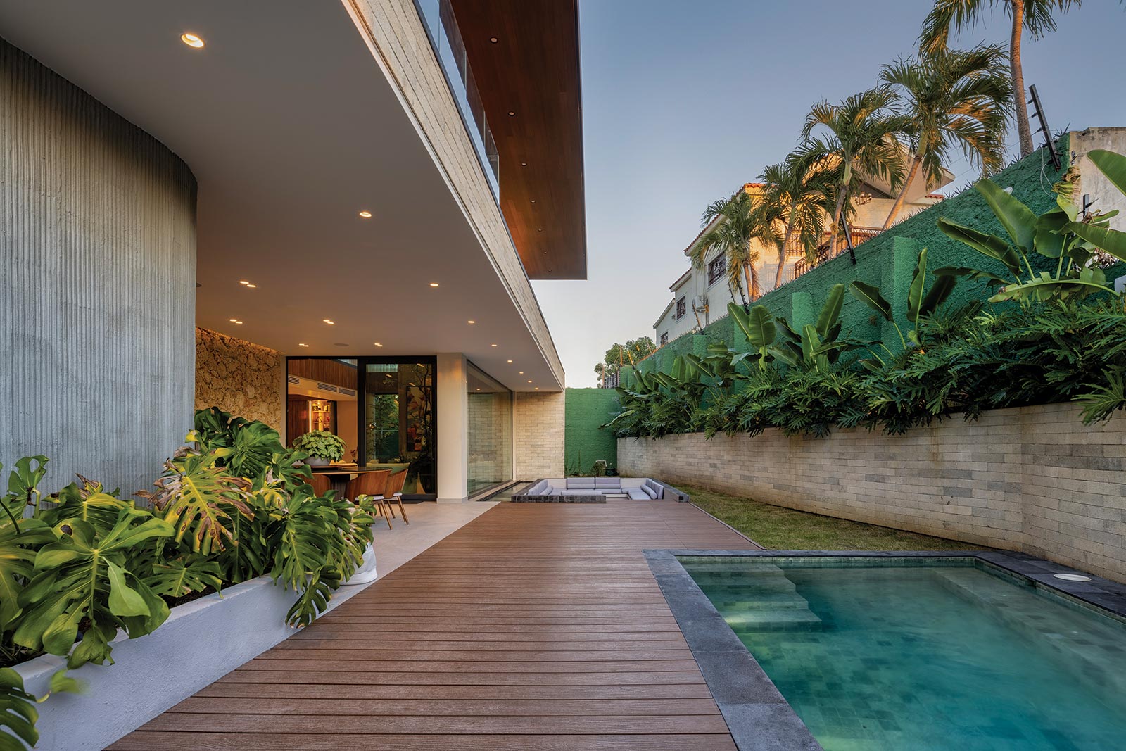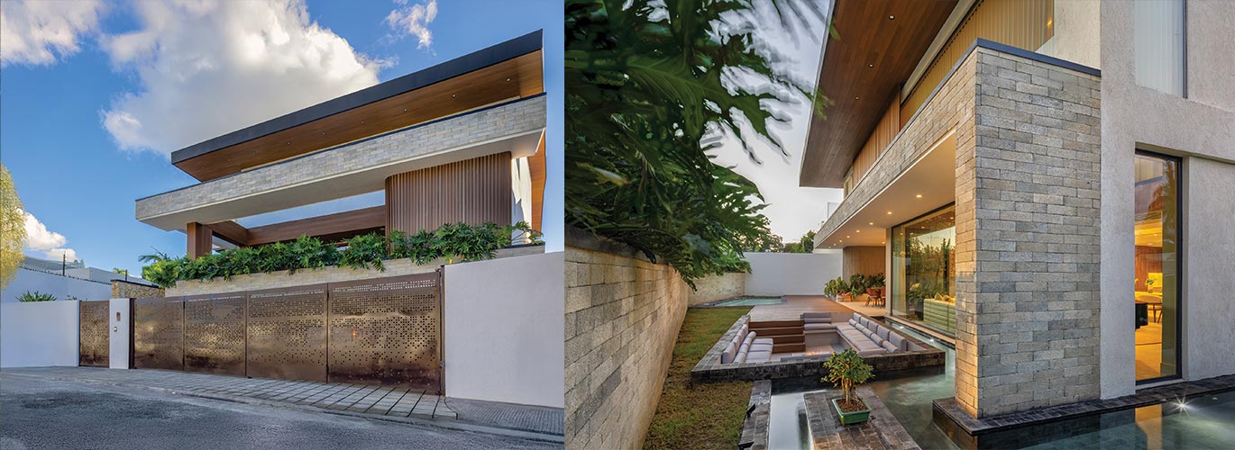 La fachada establece el primer gesto de esta transformación. Desde la calle, el volumen se percibe sobrio, casi hermético, protegido por amplios antepechos revestidos de ladrillos que proporcionan intimidad al interior. Sin embargo, conforme se accede a la vivienda, esta solidez inicial se abre a un lenguaje moderno y cálido que aprovecha la volumetría original, potenciada con el uso de materiales nobles: piedra, bloques de ladrillo local y madera sintética. El resultado es un juego de texturas contrastantes que aportan riqueza visual sin sacrificar atemporalidad. En la fachada posterior, el diseño incorpora terrazas con amplios vuelos, jardineras y la piscina que refrescan y dinamizan la composición, y refuerzan la conexión interior-exterior.
