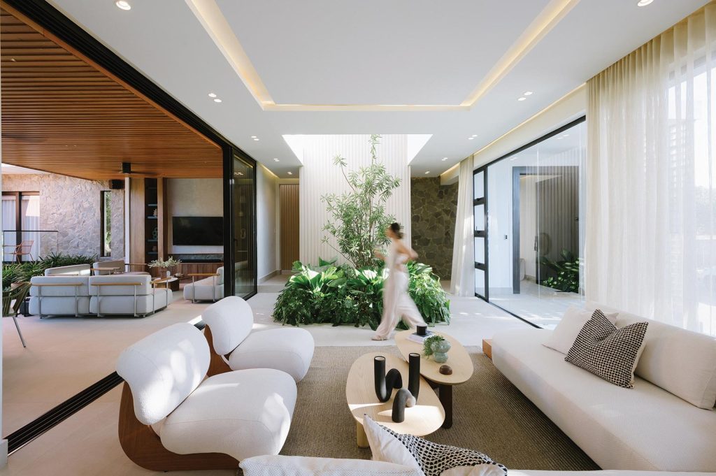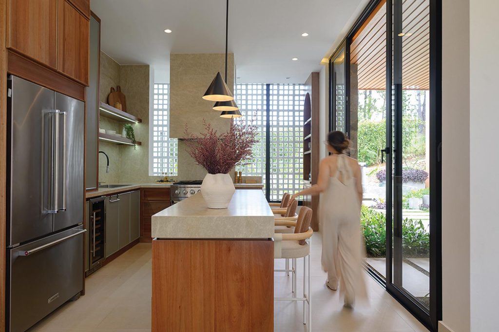 El uso de piedra, madera y bloques calados, junto con un interiorismo de colores neutros y vegetación integrada, crea una atmósfera cálida y serena que invita a la contemplación cotidiana.