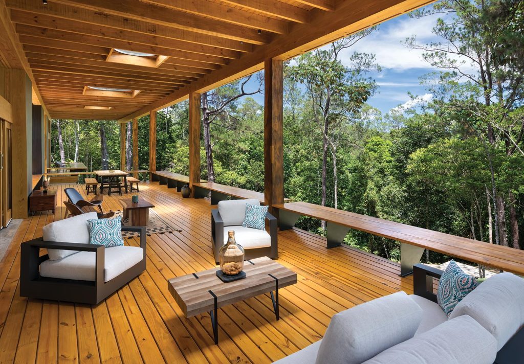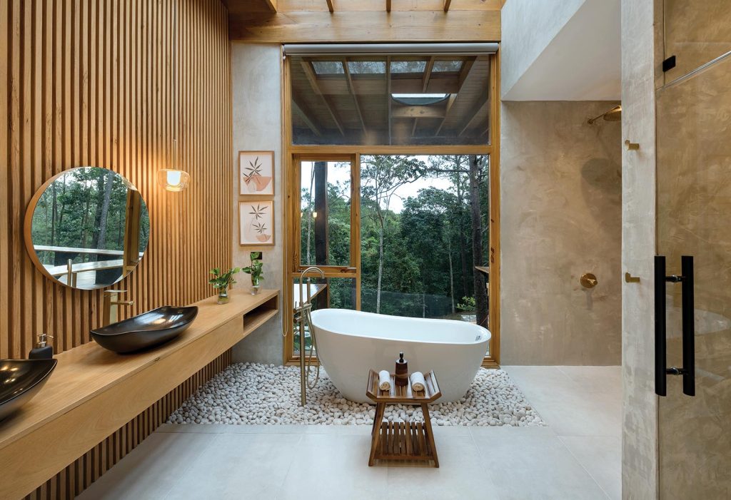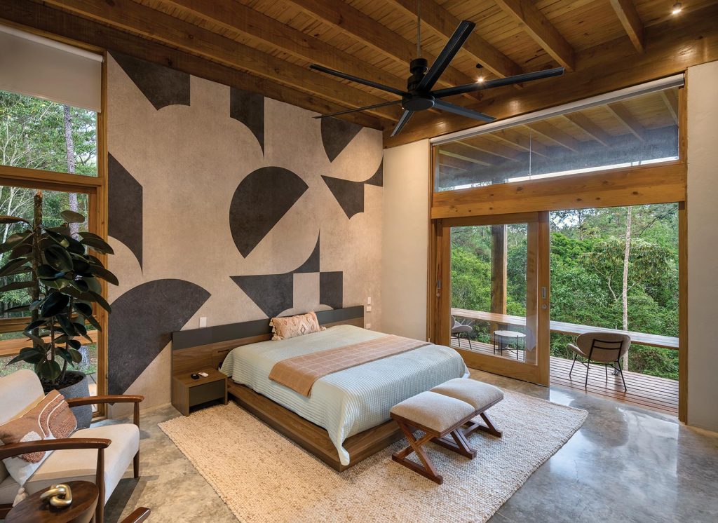 El interiorismo refuerza esta narrativa de sobriedad y conexión. Los espacios sociales se equipan con muebles de líneas limpias, piezas artesanales y telas naturales que privilegian tonos claros y texturas frescas, en sintonía con la vegetación exterior. En los dormitorios se busca la serenidad mediante una paleta neutra, mientras que las áreas exteriores introducen elementos de fibra y madera que prolongan la atmósfera natural. Desde una lámpara suspendida hasta un mueble de terraza, cada detalle fue seleccionado para acompañar, nunca para distraer.