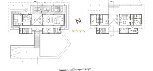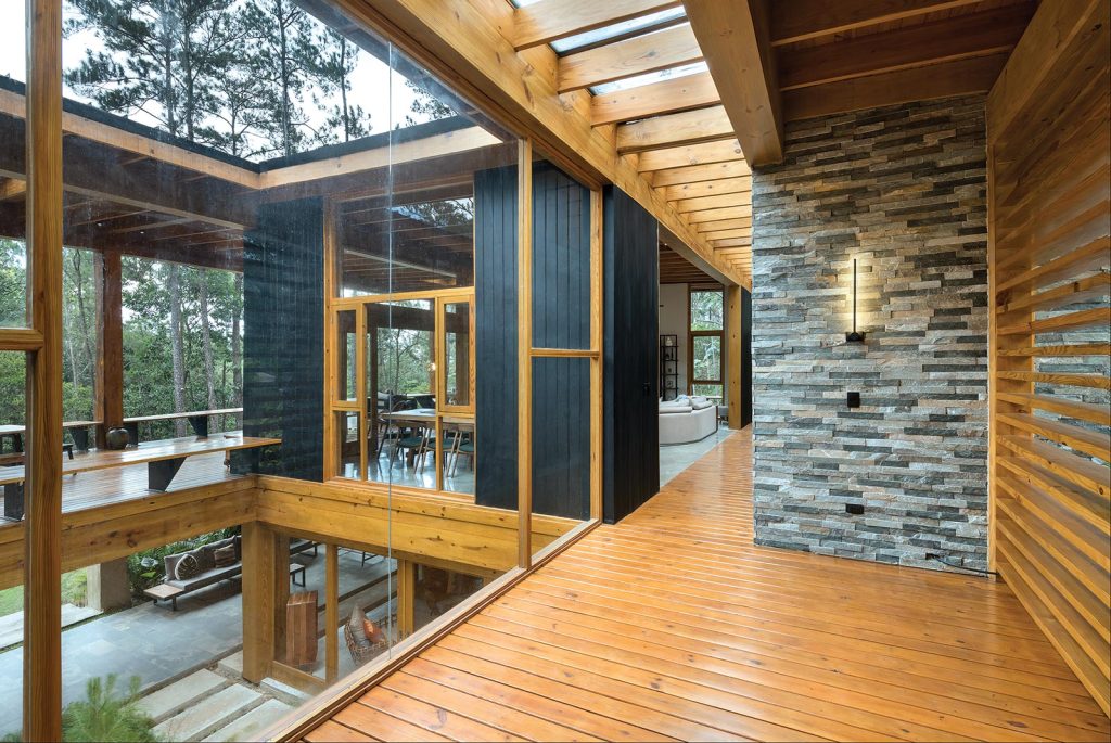En el nivel inferior, la relación con el terreno se intensifica. Aquí el atrio vuelve a ser núcleo distribuidor hacia las habitaciones de huéspedes y las áreas de servicio. Cada dormitorio de invitados fue concebido con vista directa al bosque, de modo que quienes lo habiten vivan la misma inmersión en la naturaleza que disfrutan los propietarios. La secuencia espacial de este nivel se desenlaza en otra serie de espacios sociales, un estudio con salida a una amplia terraza, y desde allí la experiencia culmina en la piscina, que más que un simple elemento recreativo está diseñada para integrarse al entorno sin imponerse en él: un espejo de agua que prolonga el horizonte y funde arquitectura y paisaje en un mismo plano.