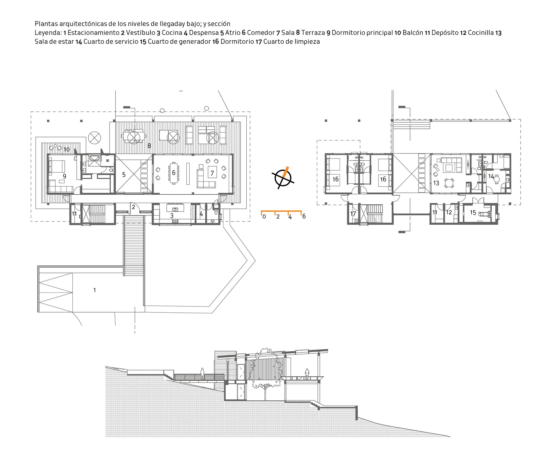 Desde el inicio, la implantación respondió a la topografía pronunciada del terreno. El acceso principal está en el nivel superior, lo que permite una llegada directa a través de un recorrido que se abre a la amplitud del entorno casi sin transición. Allí se organiza un atrio ajardinado que actúa como corazón del proyecto: un vacío central que regula la vida interior, canaliza luz y ventilación natural, y sirve de mediador entre las áreas sociales y la intimidad de la habitación principal. Este recurso dota a la vivienda de flexibilidad, pues permite a los propietarios vivir cómodamente en un solo nivel cuando están solos.