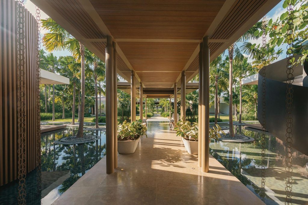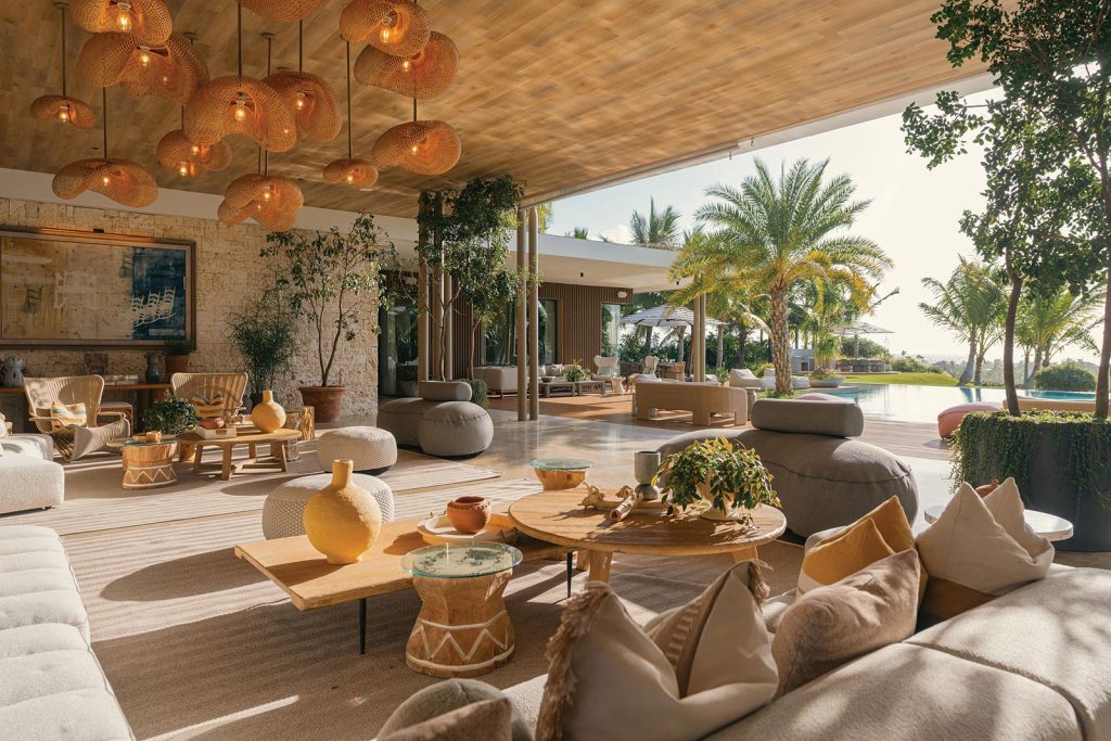 El interiorismo refuerza el diálogo entre arquitectura y paisaje a través de una selección de mobiliario y complementos que privilegian la frescura y la naturalidad. Predominan las telas ligeras y los colores claros, que aportan luminosidad y serenidad a los espacios, mientras que los muebles de fibras naturales, como ratán y mimbre, evocan la tradición artesanal caribeña con un aire contemporáneo. Lámparas colgantes de gran escala de materiales tejidos introducen un gesto escultórico que dinamiza las áreas sociales a la vez que conecta con el entorno tropical. Elementos decorativos de cerámica, piedra y madera, dispuestos en mesas y consolas, suman calidez y textura, una atmósfera relajada, elegante y profundamente vinculada al espíritu del lugar.