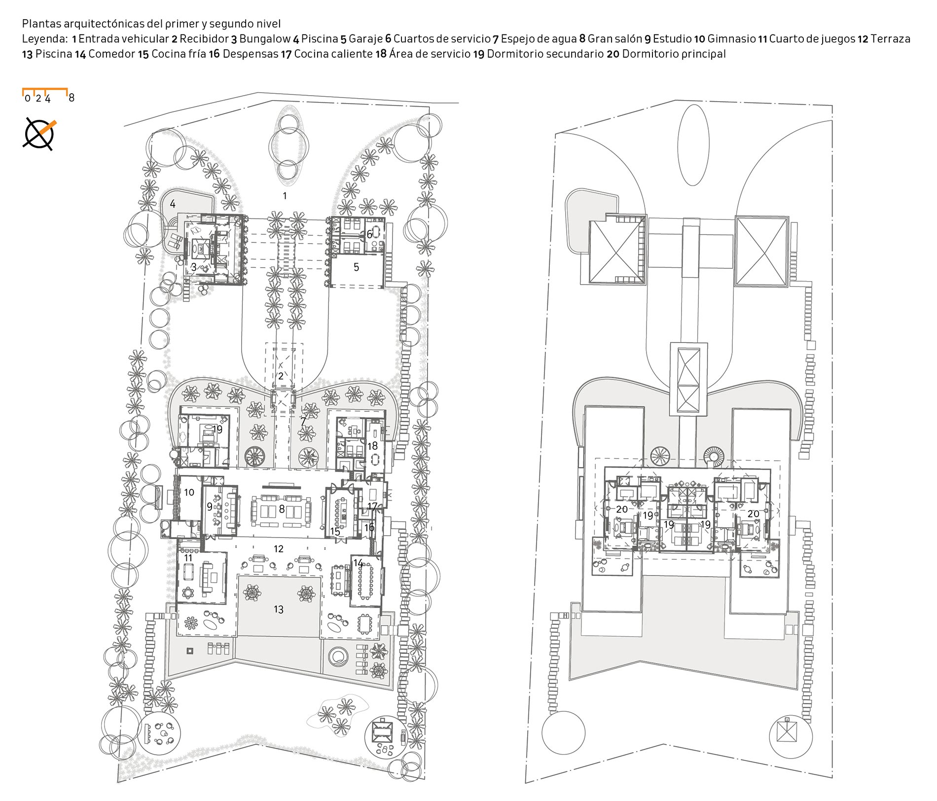 La organización programática refuerza esta narrativa. En el nivel de acceso, un pórtico central separa dos volúmenes autónomos: un bungalow para huéspedes con piscina privada y el bloque de servicio que integra garaje, áreas técnicas y vivienda para el personal. En la planta baja, un gran salón articula las dos alas de la casa, dispuestas simétricamente. Una está destinada al entretenimiento y bienestar, con salón de juegos, cine, gimnasio, spa y habitación de visitas. La otra se orienta a los espacios sociales y de servicio: comedor, bodega, cocina, oficina y áreas de apoyo. Una escalera helicoidal se convierte en una pieza escultórica sobre uno de los espejos de agua, con acceso al segundo nivel.