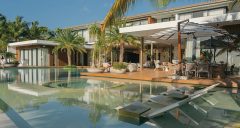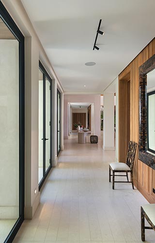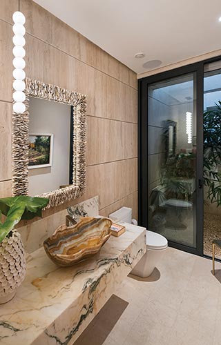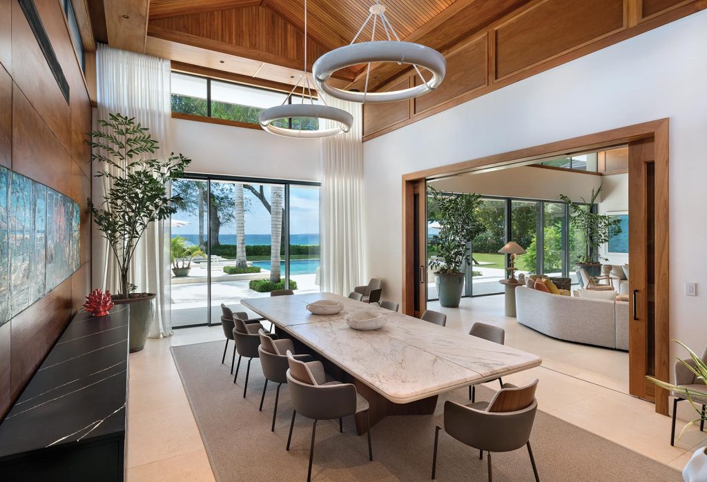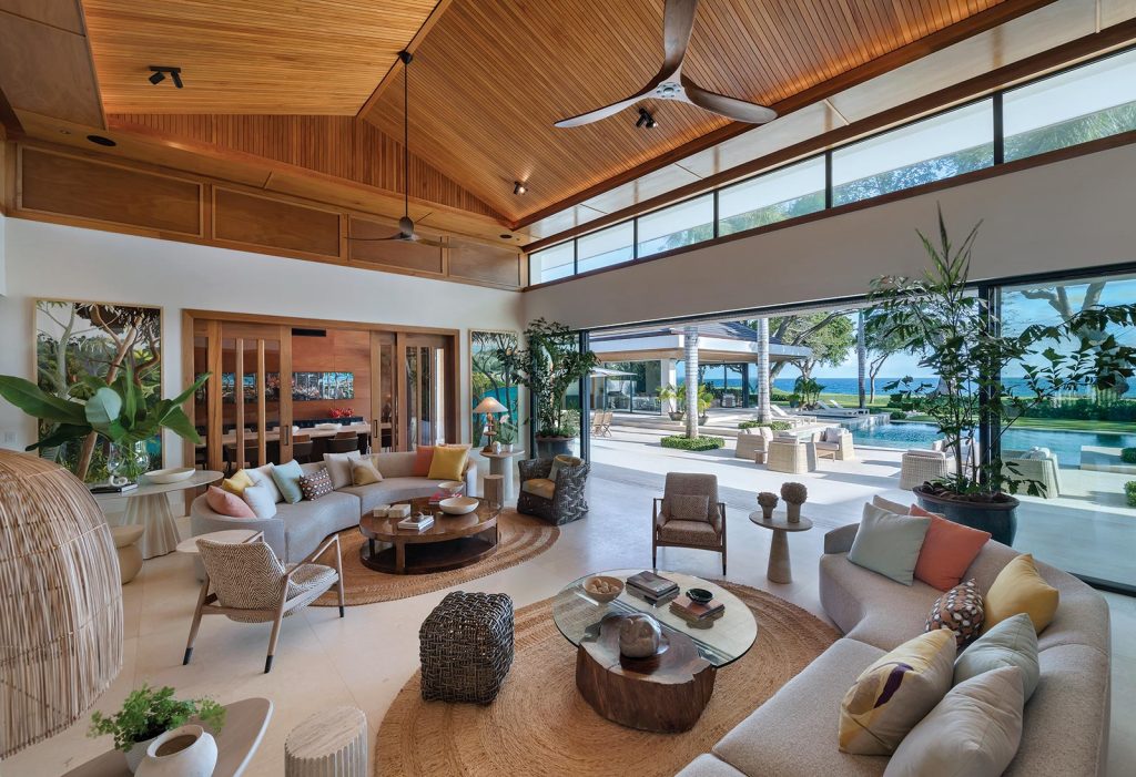 Su materialidad combina travertino, madera sintética y carpinterías ligeras, y genera ambientes frescos y elegantes. La organización espacial está marcada por un eje central visual, y articula confort, privacidad y una estrecha relación con el paisaje caribeño.