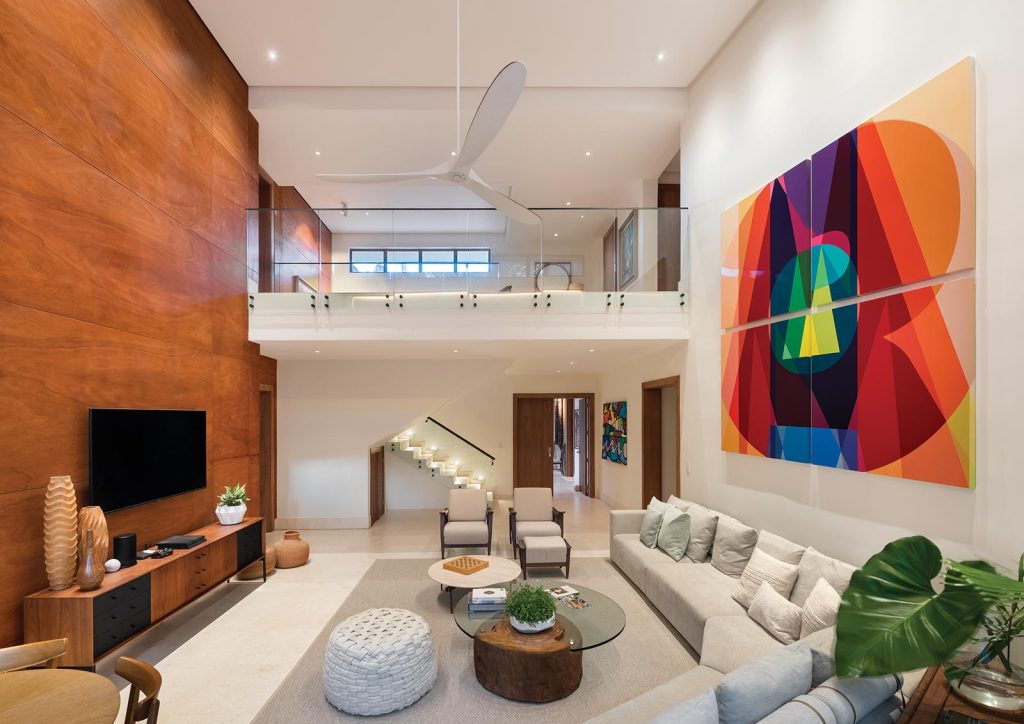 El interiorismo concuerda con el concepto arquitectónico: privilegia la neutralidad y la amplitud. Muebles de líneas limpias, tapizados claros y piezas artesanales dominicanas se combinan para crear ambientes confortables, frescos y elegantes. La doble altura del salón central refuerza la monumentalidad del espacio, mientras que la iluminación natural y la ventilación cruzada garantizan eficiencia climática y confort ambiental. La atmósfera se enriquece además con una curaduría de arte que incluye obras de Boa Mistura en el gran salón, así como piezas de García Cordero, Clara Ledesma, Julio Valdez y otros artistas. Estas intervenciones artísticas no solo embellecen los espacios, sino que aportan carácter cultural y establecen un diálogo directo entre la arquitectura y las artes visuales.