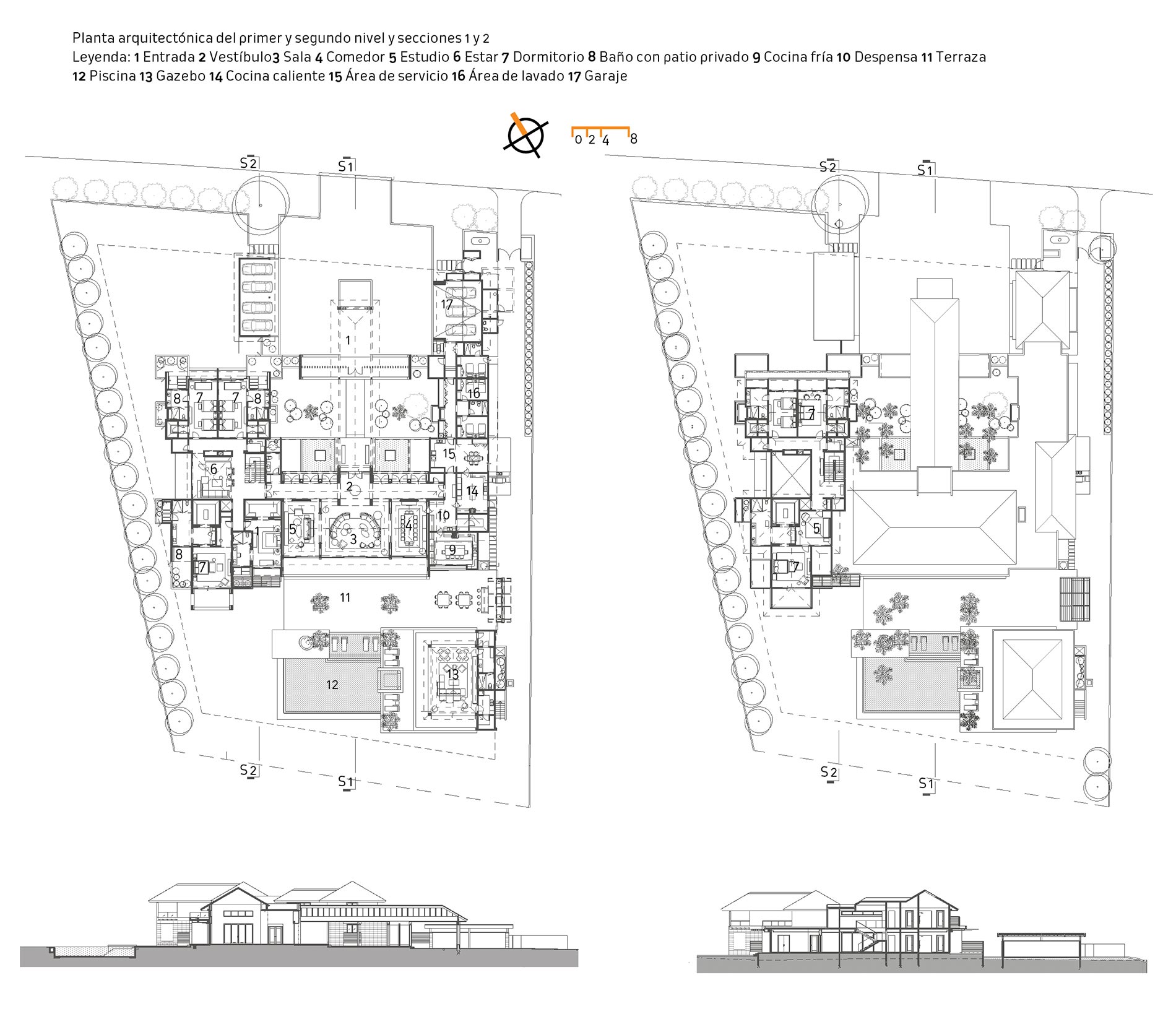 A la izquierda del salón se organizan las áreas de servicio: cocinas caliente y fría, despensa, comedor de apoyo, lavandería y dormitorios de servicio. Esta disposición garantiza eficiencia funcional y circulación diferenciada. Al lado opuesto, un bloque de dos niveles concentra las áreas privadas: en planta baja se distribuyen cuatro habitaciones secundarias, todas con baño en suite y vestidor [walk-in closet], con privacidad y confort.