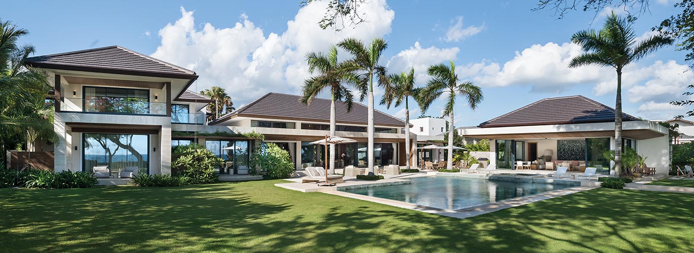 La volumetría combina planos horizontales con techos inclinados de inspiración tropical, resueltos con un lenguaje contemporáneo de líneas sobrias y proporciones equilibradas. La materialidad refuerza esta dualidad: revestimientos de travertino, maderas sintéticas y carpinterías ligeras se conjugan para aportar calidez y atemporalidad, y dialogan tanto con el clima caribeño como con el carácter elegante de Casa de Campo.