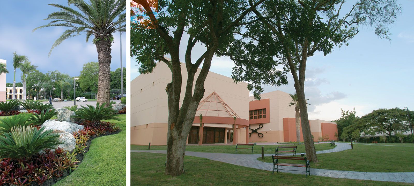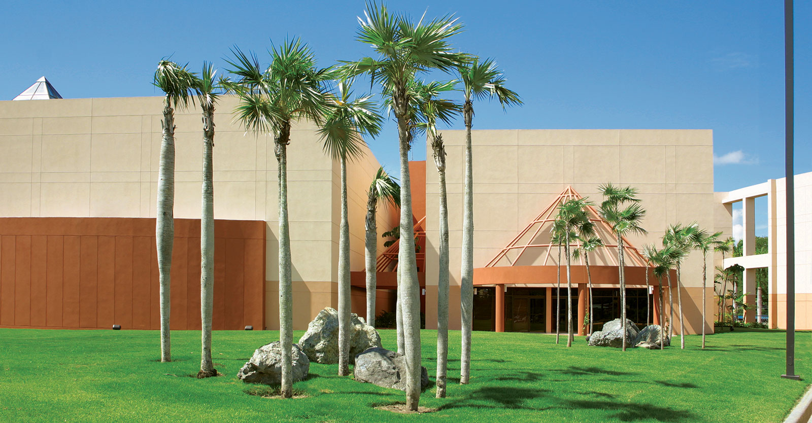 El diseño paisajístico constituye un componente esencial del proyecto. Los jardines, compuestos mayoritariamente por especies nativas, rodean el edificio sin competir con él, reforzando la intención de integrar naturaleza y arquitectura. Palmas, árboles y arbustos fueron cuidadosamente seleccionados y trasplantados, creando un entorno que remite a la riqueza natural del Caribe.