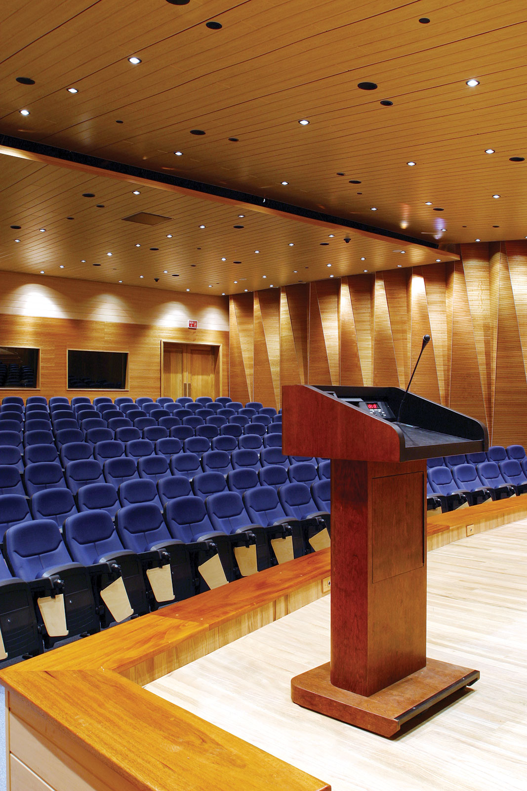 El auditorio, con capacidad para 200 personas, está equipado con tecnología multimedia y sistemas de traducción simultánea, lo que lo hace apto para conferencias magistrales, encuentros internacionales y presentaciones artísticas. Su diseño interior prioriza la calidad acústica, lograda mediante revestimientos de madera y la asesoría de un especialista en acústica, integrando técnica y diseño.