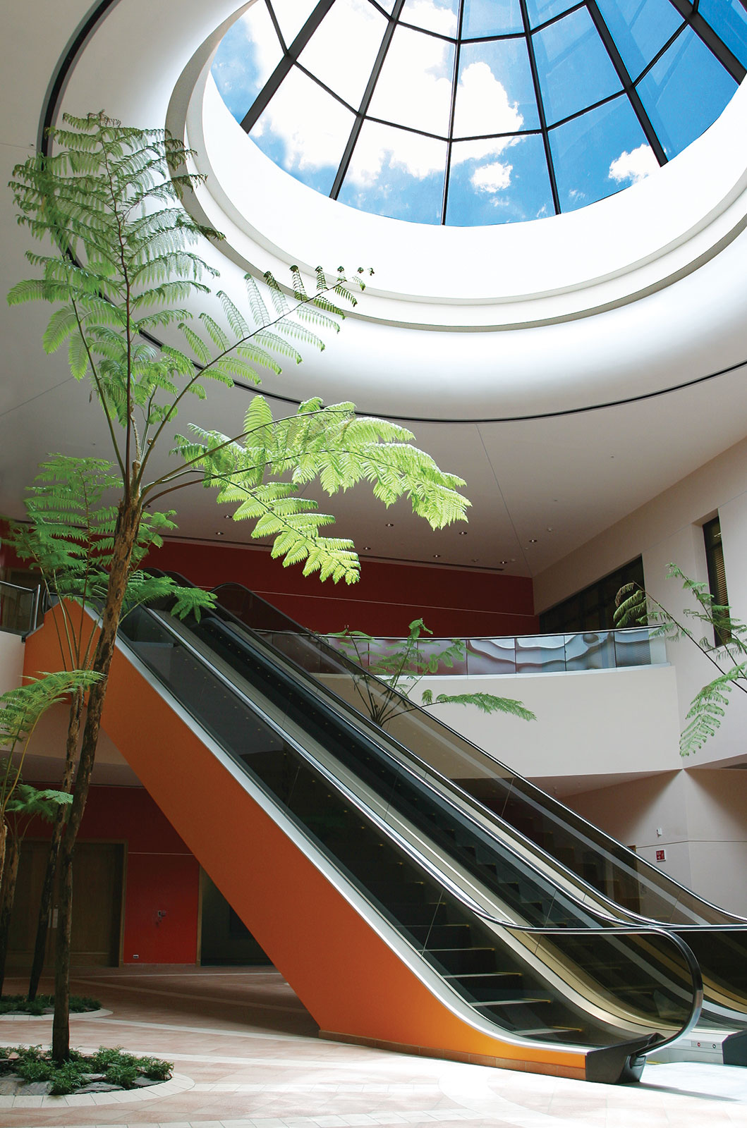Este patio central se concibe como un gran atrio circular, con palmeras y vegetación, cubierto por un tragaluz cónico que introduce luz natural de manera controlada. Alrededor de este espacio se organizan las circulaciones y accesos a las salas de exhibición y al auditorio. El diseño radial del pavimento y del cielo raso refuerza la centralidad del espacio, mientras que las escaleras mecánicas se convierten en un elemento articulador del recorrido vertical.