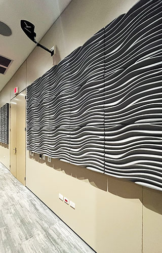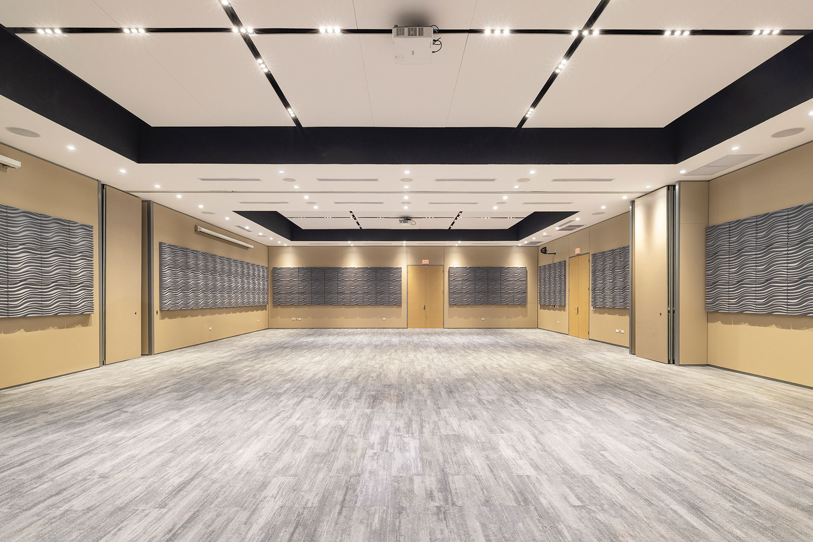 Especial atención merece el salón multiusos, bautizado en honor a don Giovanni Bloise Guzmán, el único fundador vivo de la institución, hoy con 101 años. El salón tiene capacidad para 560 personas y está equipado con tecnología de vanguardia en sistemas audiovisuales, climatización e iluminación, lo que garantiza un desempeño óptimo para eventos corporativos y comunitarios. Sus divisiones móviles instaladas por Thema permiten subdividirlo en tres salas independientes para actividades simultáneas. Se destaca el diseño del cielo raso, conformado por plafones suspendidos que, en conjunto con la iluminación, generan una atmósfera elegante y controlada. Para mejorar el confort acústico, se incorporaron paneles fonoabsorbentes en las paredes.
