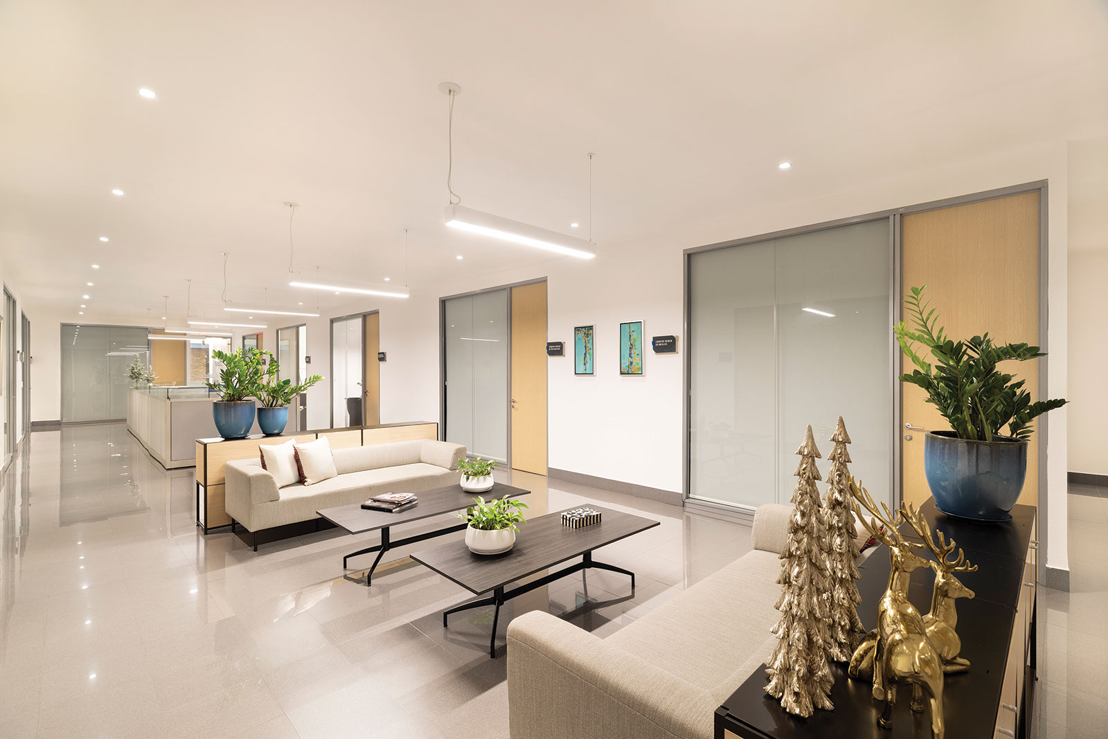 El interiorismo responde a un equipamiento contemporáneo. Las particiones de las oficinas se resuelven mediante tabiques modulares que facilitan la reconfiguración de los espacios y garantizan privacidad acústica. La luz natural baña las áreas de trabajo gracias a amplios cerramientos de cristal, desde los cuales se disfruta la ciudad filtrada por los paneles traslúcidos y la silueta de los flamboyanes. Predomina una paleta de colores claros en los elementos espaciales y en el mobiliario, contrastada por piezas puntuales de madera oscura.