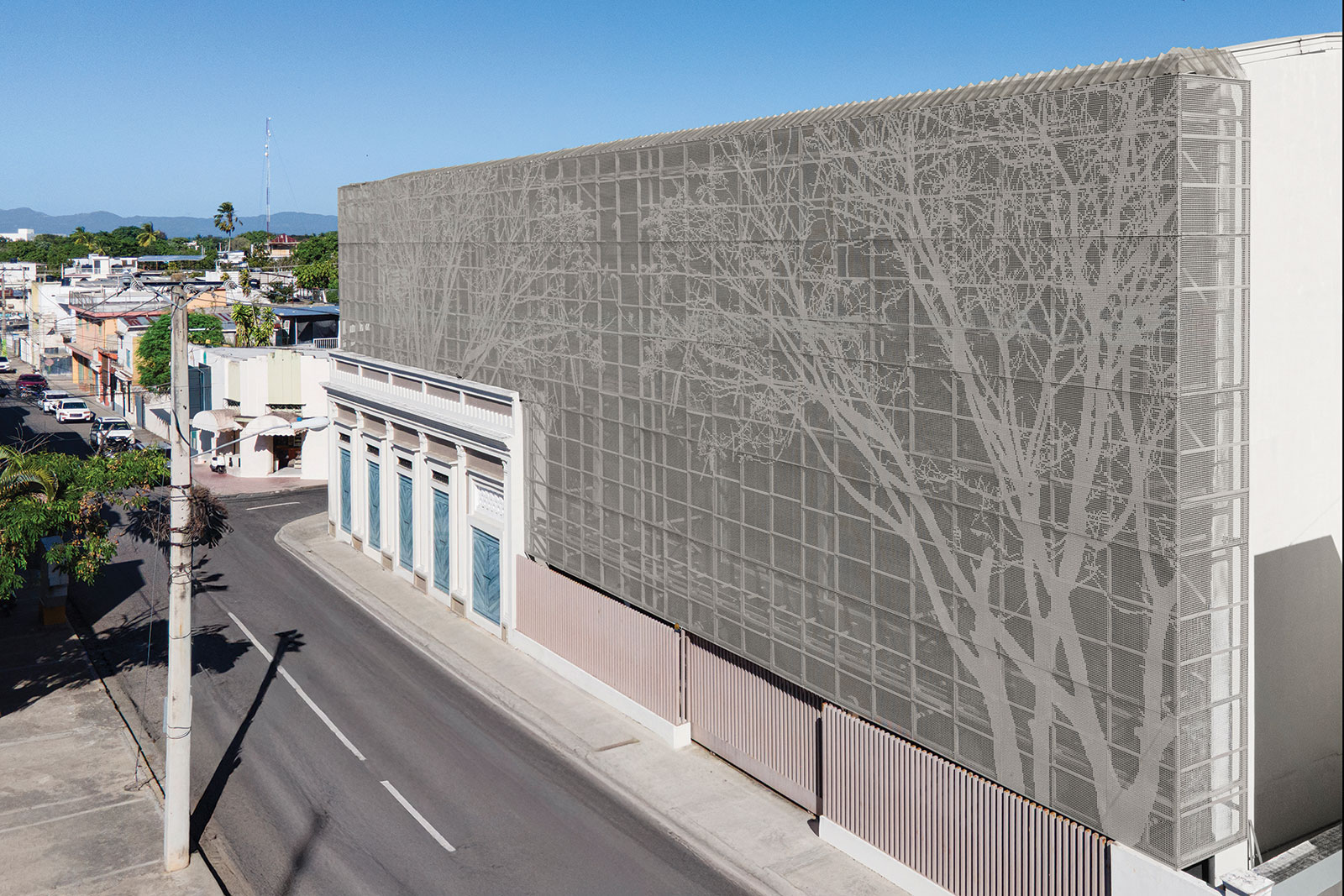 La nueva arquitectura se identifica en la fachada mediante paneles traslúcidos y microperforados que envuelven los niveles superiores e interpretan el patrimonio desde un lenguaje actual. Esta piel metálica proyecta la imagen de un framboyán, símbolo profundamente arraigado en la memoria colectiva vegana. Además de otorgar identidad, tamiza la luz natural, genera privacidad y calidez en los interiores y aporta un sello distintivo a la actualización del inmueble. Un detalle novedoso es la incorporación de un sistema de iluminación programable en la fachada, capaz de cambiar de color para expresar el “estado anímico” del edificio, establecer vínculos simbólicos con la comunidad o destacar acontecimientos, campañas institucionales, fechas patrias y días festivos.