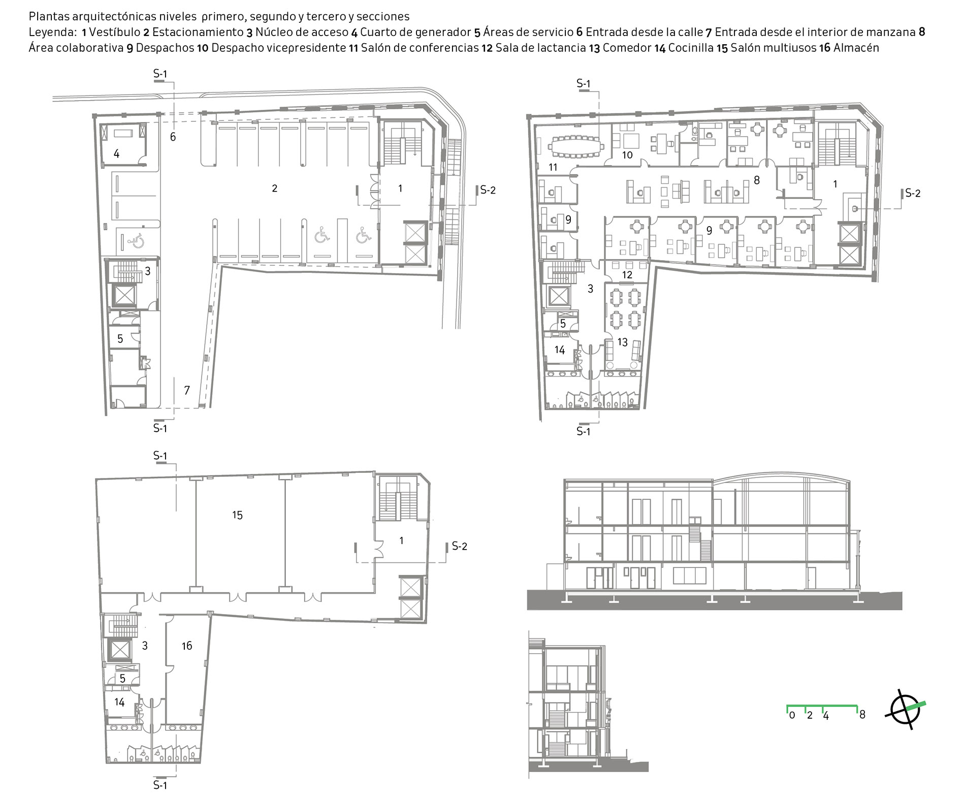 La volumetría se organiza en torno a un acceso claramente diferenciado que aprovecha la condición de esquina como punto de articulación urbana. Este vestíbulo está vinculado directamente a la circulación vertical y permite una transición fluida hacia los niveles superiores. En el segundo nivel se concentran las funciones administrativas; se estructura mediante una circulación central que maximiza el aprovechamiento de las oficinas y garantiza un funcionamiento claro y ordenado. El programa se distribuye así: primera planta: estacionamiento general, vestíbulo, almacén, cuartos técnicos y de servicio; segunda planta: vestíbulo, oficinas, sala de reuniones y sala de espera; tercera planta: vestíbulo y un gran salón multiusos. Cada nivel incorpora áreas de apoyo que garantizan una operación continua y eficiente: cuartos técnicos, cocinilla, zonas de descanso para el personal y baños.