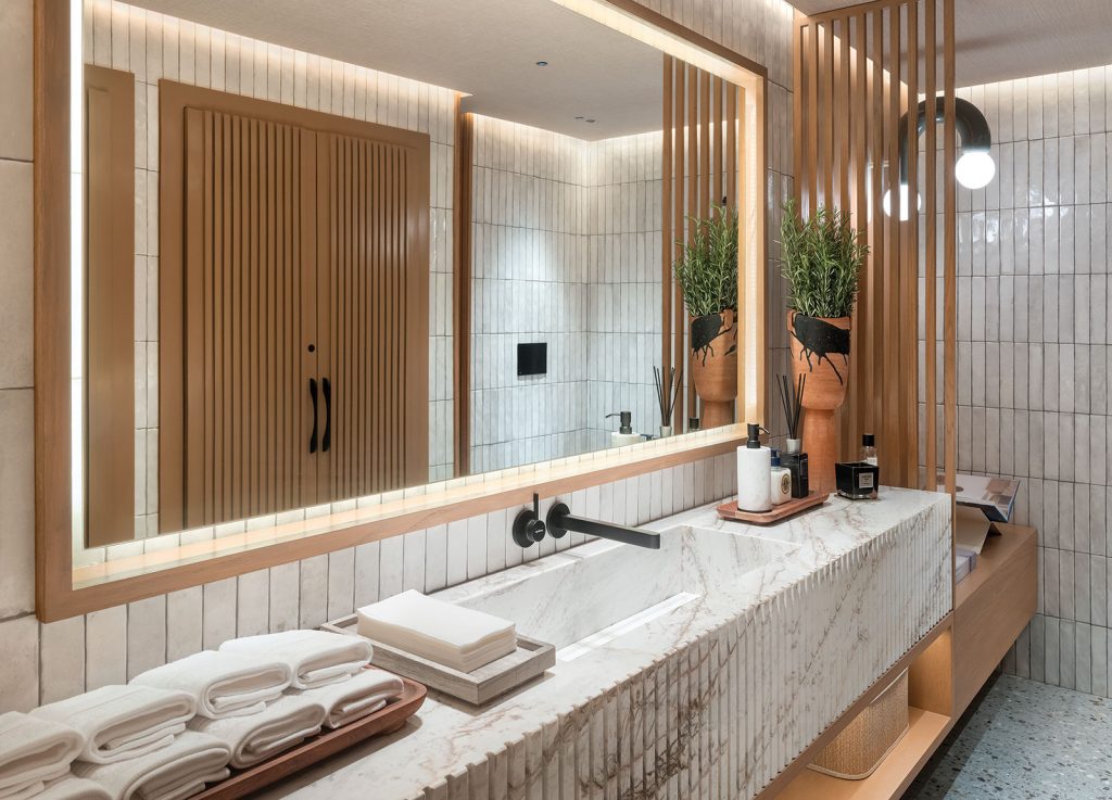 El paisajismo fue concebido por la arquitecta Massiel Mejía e introduce una dimensión sensorial esencial al proyecto. Inspirada en el bosque seco dominicano, su propuesta vegetal establece un diálogo entre la materialidad del suelo y la fachada, y los valores de la marca orientados hacia lo natural. Este contraste enriquece la experiencia desde el ingreso, con una atmósfera de serenidad, conexión con la naturaleza y bienestar emocional que acompaña al visitante a lo largo del recorrido.