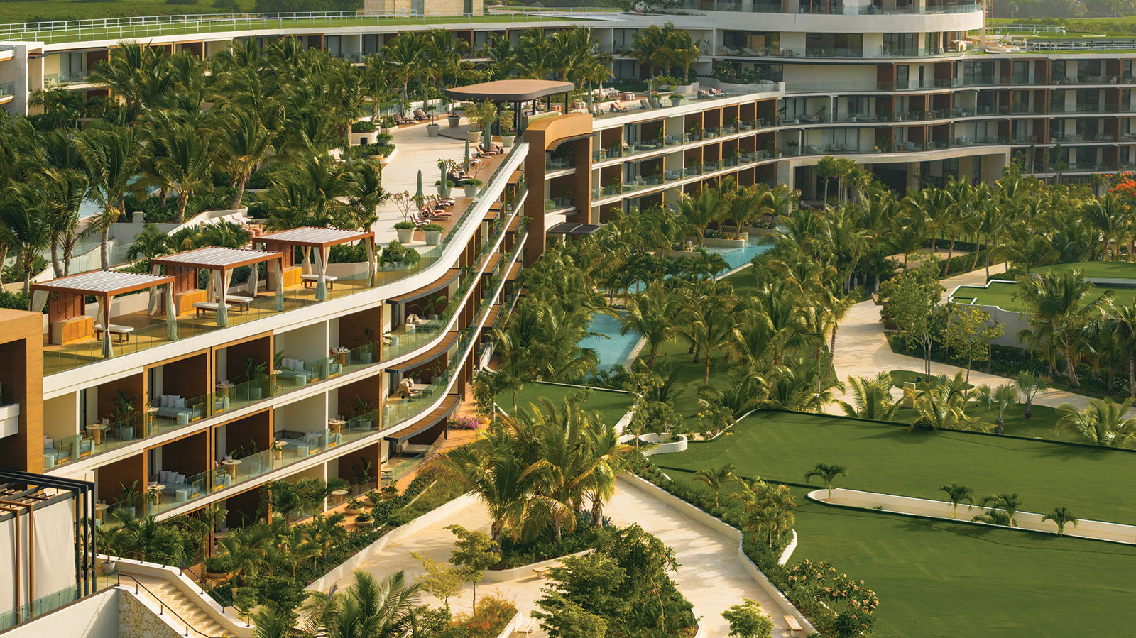 Desde esta ubicación excepcional redefine el lujo tropical contemporáneo. Su arquitectura emerge del paisaje inspirada en las líneas, curvas y niveles del terreno, una geometría en dogleg que define su volumetría.