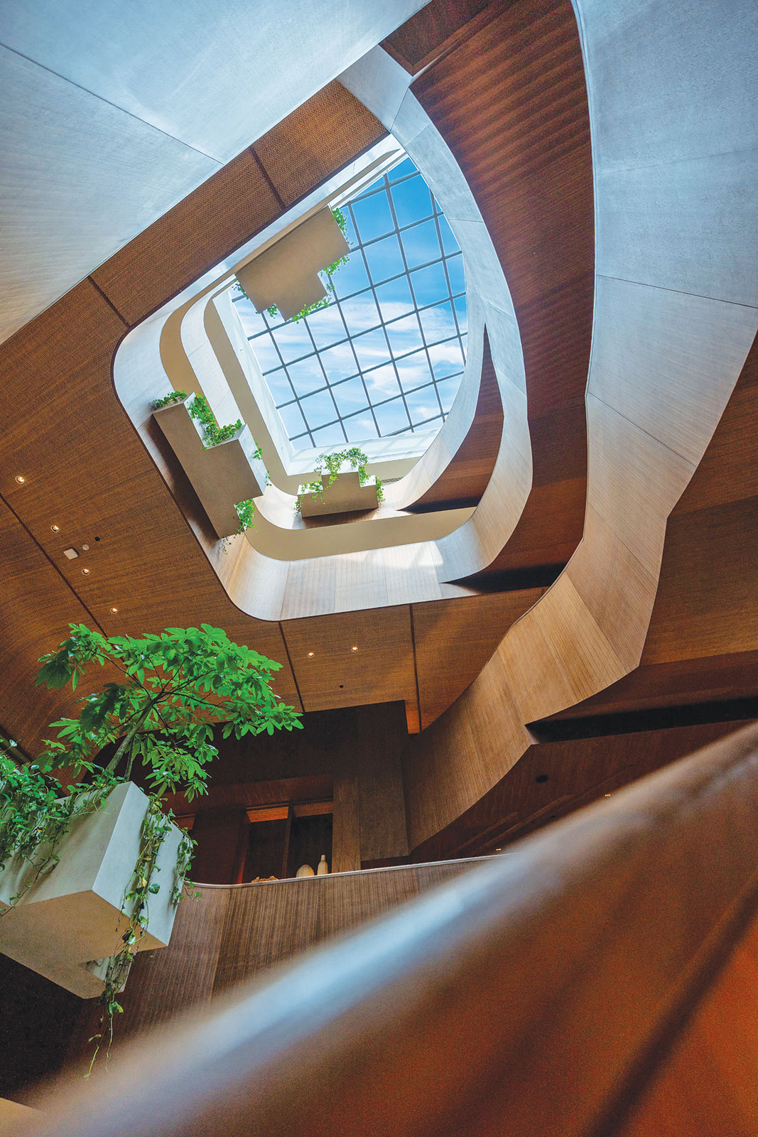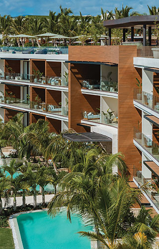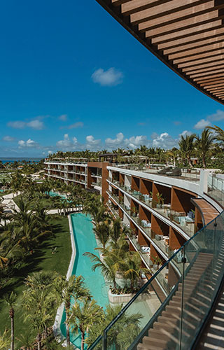 Al adentrarnos en las instalaciones y pasar la recepción, nos recibe un atrio de cinco niveles de altura inspirado en un cenote, con una cascada que comienza en un tragaluz. En el centro se encuentran las «escaleras danzantes», una escalinata escultórica que conecta verticalmente los espacios insignia de la marca. Este espacio, el restaurante de especialidad con vistas únicas al farallón y el spa con terrazas exteriores con vista al mar conforman una narrativa espacial que sorprende con cada transición. Los cambios de nivel permiten configurar miradores constantes y rutas abiertas al clima tropical.