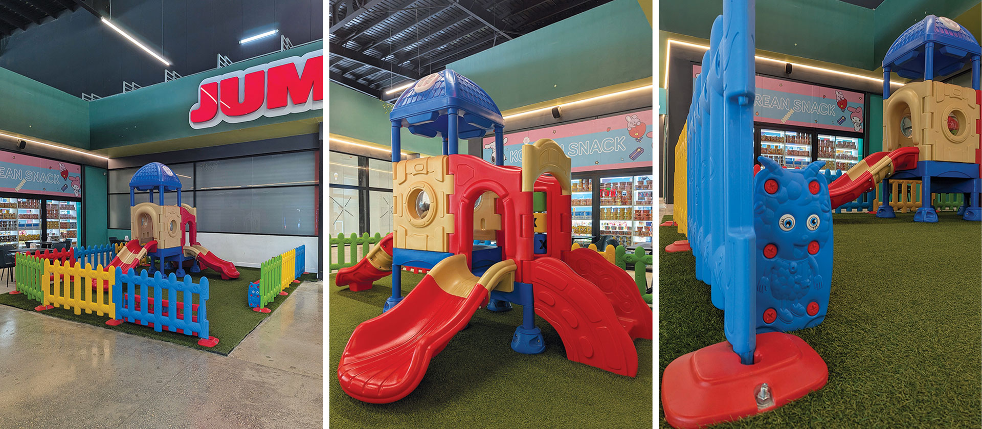 La instalación incluye un parque infantil de plástico resistente con doble deslizador, piso de césped artificial, verja perimetral colorida y zapatera independiente, elementos que en conjunto contribuyen a la organización, higiene y correcto funcionamiento del área. El césped artificial aporta una superficie confortable, estética y de fácil mantenimiento, ideal para espacios de uso continuo dentro de plazas comerciales.