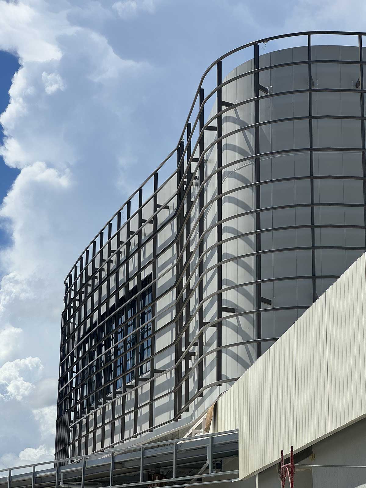 Otro caso significativo es el Centro Cultural Rainieri, actualmente en ejecución, cuya fachada principal —de más de 2,000 metros cuadrados— integra piezas metálicas con tolerancias de apenas 2 milímetros. El sistema de ensamblaje machihembrado, con diseño variable en cada pieza, exige una precisión absoluta para mantener la continuidad de las líneas verticales y horizontales. En proyectos de esta escala, el acero no solo resuelve cargas estructurales; define la imagen arquitectónica.
